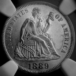 This 1889(P) Seated Liberty dime shows strong, unabraded clash marks on both the obverse and reverse dies.