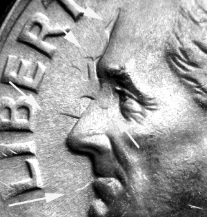 In the next picture, the mint mark clash can be seen just below the left leg of the A in AMERICA, while the lower bust line can be seen just below that. The clash mark left by the lower portion of Roosevelt’s ear can be seen between the torch and the cluster of oak leaves. A small clash mark to the left of the IC of AMERICA was left by the backside of Roosevelt’s head