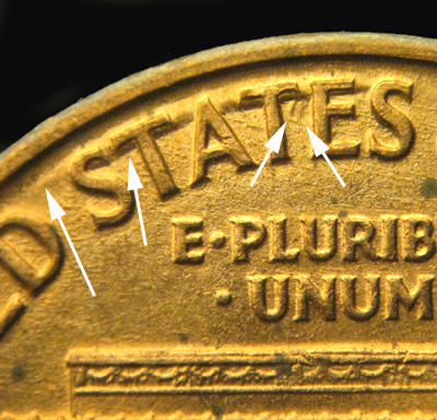 The reverse die has a large die chip under the left vertical bar of the T in CENT.