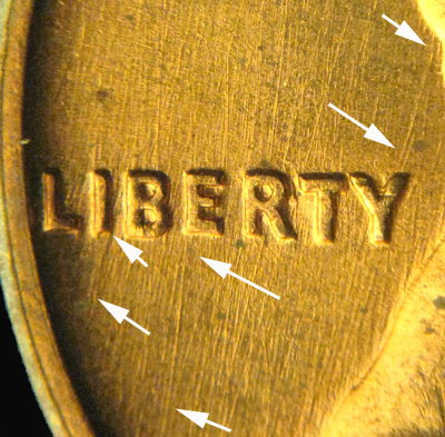 These clash events may be identified by the strong obverse die scratching through the word LIBERTY. Also seen is an odd shaped die scratch just to the bottom left of the 9 digit in the date.