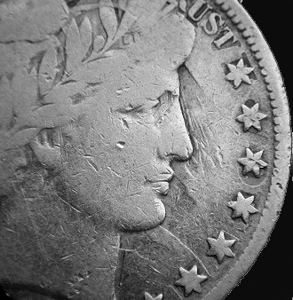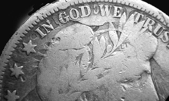 This is a spectacular die clash found on a 1912 Liberty Head half dollar. Even though the coin is in a lower grade (VG-08), the clash marks left by the transer of design elements onto the opposing dies are extremely clear. It will more than likely rank as one of the strongest if not the strongest die clash found on U. S. coins.