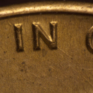 This single clash event occurred on a 1983 P Lincoln cent. The overlay provided shows the relative position of the dies during the clash event. This coin shows unabraded clash marks. Die markers for this die clash can be found as a die scratch extending toward the southeast from the bottom of the N of IN and two die scratches between the lower first T and R of TRUST.