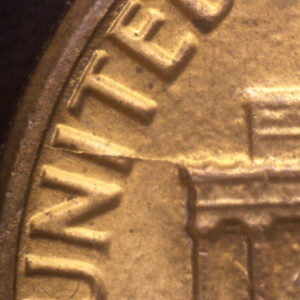 This single clash event occurred on a 1983 P Lincoln cent. The overlay provided shows the relative position of the dies during the clash event. Even though there is an obvious tillt to the clash, the amount of the tilt is typically seen on this era’s cents. This coin shows unabraded clash marks on the obverse and heavily abraided clash marks on the reverse. Die markers for this die clash can be found as a die scratches above the O of One and a die crack extending from the upper left corner of memorial through the I of UNITED.