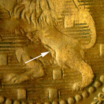 The obverse shows a small portion of the 1 digit from the reverse above the lion’s left knee (white arrow).